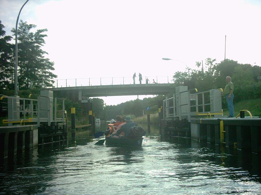 Im Labussee danach fuhren wir dann sehr zügig, den Wind schräg von vorn (unglücklicherweise hatte er sich gedreht) und erreichten um 19:15h die Schleuse, wo wir erfuhren, daß um 19:30 h die letzte Schleusung des Tages stattfinden sollte. Darüber waren wir sehr foh, und der Schleusenwärter hatte dann nur uns als einzige Gäste. Ein Umtragen an dieser Stelle wäre sehr schwierig gewesen.
