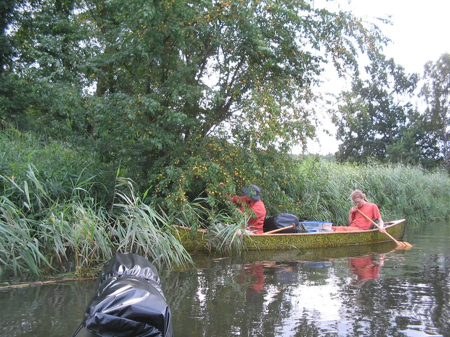 Die Faltbootzweier paddeln etwas vor uns, wir sehen sie bald an einem Mirabellenbaum anlegen, was wir ihnen nachtun. Es stellt sich schnell heraus, dass die Mirabellen für das "Hand - in Mund - Verfahren" zu unreif sind, so ernten wir nur ein wenige, um sie in unserem nächsten Haferfrühstück mit zu kochen.