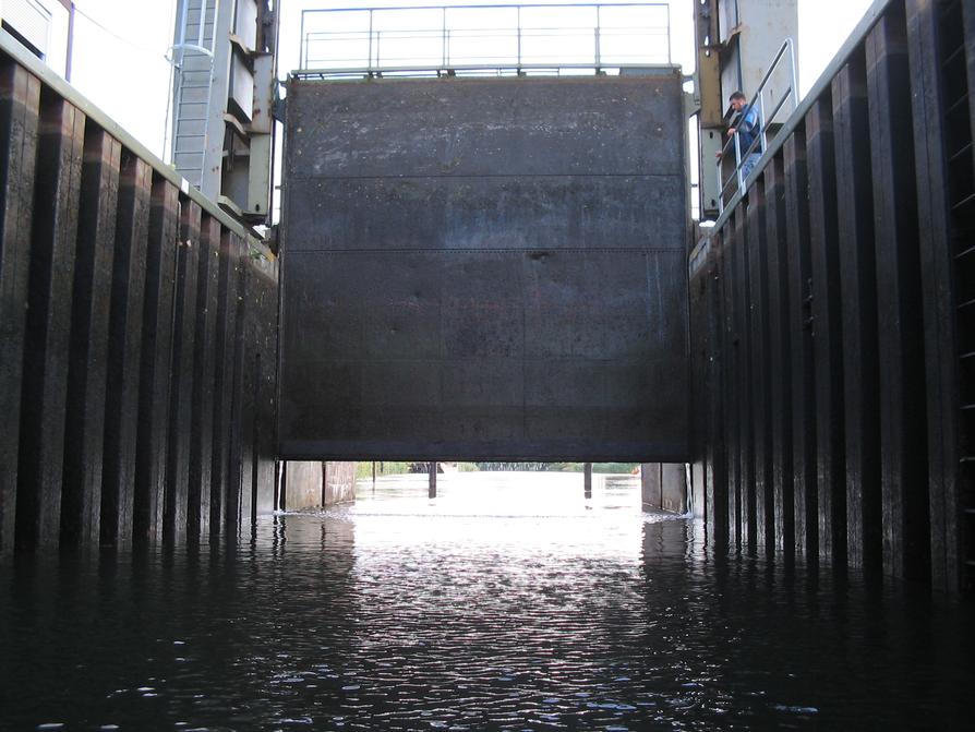 Am Morgen .des 4. August ist der Himmel wieder sehr nett zu uns wie bisher meist, wir frühstücken im strahlenden Sonnenschein Brötchen, die ich beim nahen Bäcker erstand. Bis die Zelte abgebaut und die Kanus bepackt sind, vergehen jedoch noch 2 Stunden. Gegen 10:15 Uhr verlassen wir den kleinen Hafen, um uns durchschleusen zu lassen. Da die Schleusung noch ein wenig auf sich warten lässt, paddle ich einige Meter in den Mühlengraben, wo ich schöne "Vorgärten" und nette Hinterhöfe finde, während Gundula und Alexander auf die Schleusung warten. Pünktlich zur Schleusung bin ich zurück.