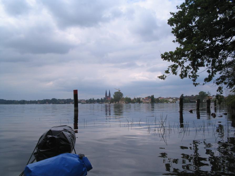 Der Ruppiner See ist etwa 15 km lang und ziemlich schmal, das erste Stück von gut 2,5 km wird jedoch von einem künstlich angelegten Eisenbahn - und Straßendamm unterbrochen. Es gibt zwei Durchlässe: am linken Ufer und am rechten, man muss immer denjenigen benutzen, der rechts von einem liegt. Als ich durch bin, regnet es stärker, aber es ist total still, und das ergibt eine sehr angenehme Stimmung.