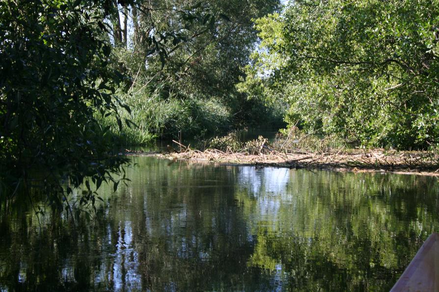 Eine halbe Stunde später muß ich aus dem Kanu, eine halbwüchsige Pappel meint, den Friedländer Strom hier sperren zu müssen. Wer hat ihr das erlaubt? Wahrscheinlich war es der Sturm, der vor ein paar Tagen hier eine Schneise der Verwüstung hinterlassen hat. Ich steige mal wieder ganz vorne aus meinem Kanu aus und klettere auf den relativ dünnen Baumstamm. Wie schon so oft, ziehe ich mein Holzkanu mitsamt dem Gepäck einfach über das Baumhindernis. Als ich wieder einsteige, hänge ich noch etwas im schwimmenden Geäst der Papel fest, kann mich aber bald durchstoßen. Wie gut, dass ich das Kunstoffpaddel dabei habe. Wenn ich das kille, ist es nicht so schlimm wie es beim Holzpaddel wäre. Der nächste Baum liegt keine 100 m weiter, er hat mir jedoch eine winzige Lücke gelassen, als ich mich ganz klein mache im Kanu komme ich durch.