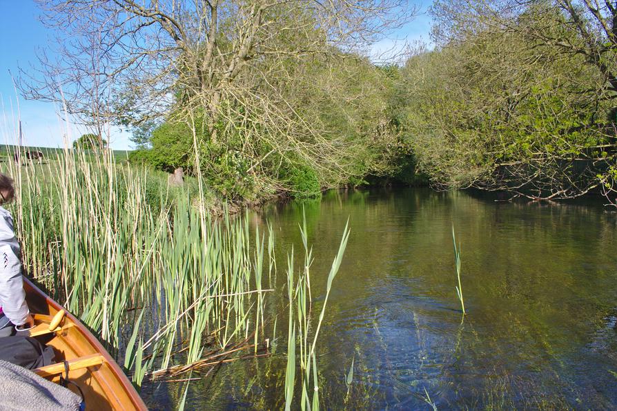 Dort, wo die Schwentine richtig schmal aus der Großen Breite heraus fließt, legen wir uns für einige Zeit links ins niedrige Schilf. Wir schauen den Kühen zu und lauschen dem Gesang des Sprossers, der hier seinen Gesang ähnlich dem der Nachtigall zelebriert. So etwas entzückt mich immer wieder, und wir halten uns noch eine ganze Weile dort auf. Der Weißdorn duftet, und wir bewundern die große Eiche, die dort am steilen Ufer der Schwentine steht. Einige Eschen sind noch immer nicht richtig grün.