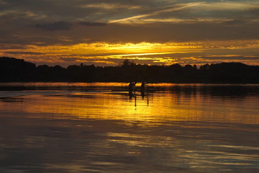 Allmählich geht das Sonnenlicht ins Orange über, und die Bewölkung lässt ab und zu den kleinen Feuerball blicken. Jetzt sind einige Ruderboote und auch Kanus unterwegs, und ich zähle mindestens acht Silberreiher, die verteilt an den verschiedenen Ufern stehen und manchmal auch für kurze Zeit auffliegen. Eine ältere Dame in einem Einer-Ruderboot spricht mich auf das flache Wasser und den schönen Abend an, und wir haben noch eine richtig nette Unterhaltung. Dann beeile ich mich aber trotzdem, zum Auto zurück zu kommen, bevor es ganz dunkel ist.