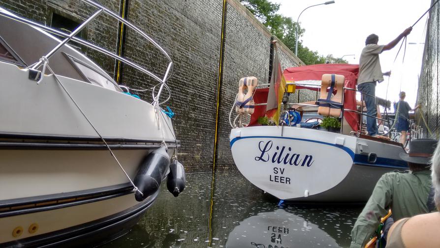Wir sind recht flott unterwegs, und so erreichen wir bereits nach einer Stunde die nur 5 km entfernte Schleuse Barkow, die uns 3,10 Meter abwärts bringen soll. Da wir eine Gegenschleusung abzuwarten haben, dauert der gesamte Vorgang doch etwa eine halbe Stunde.
