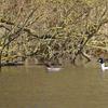 Ein Schellentenpärchen scheint sich bereits gefunden zu haben, wo allgemein noch die Balz in Gange ist. Unter dem Wurzelwerk einer vor langer Zeit umgestürzten dicken Weide hält sich ein Teichhuhn auf.