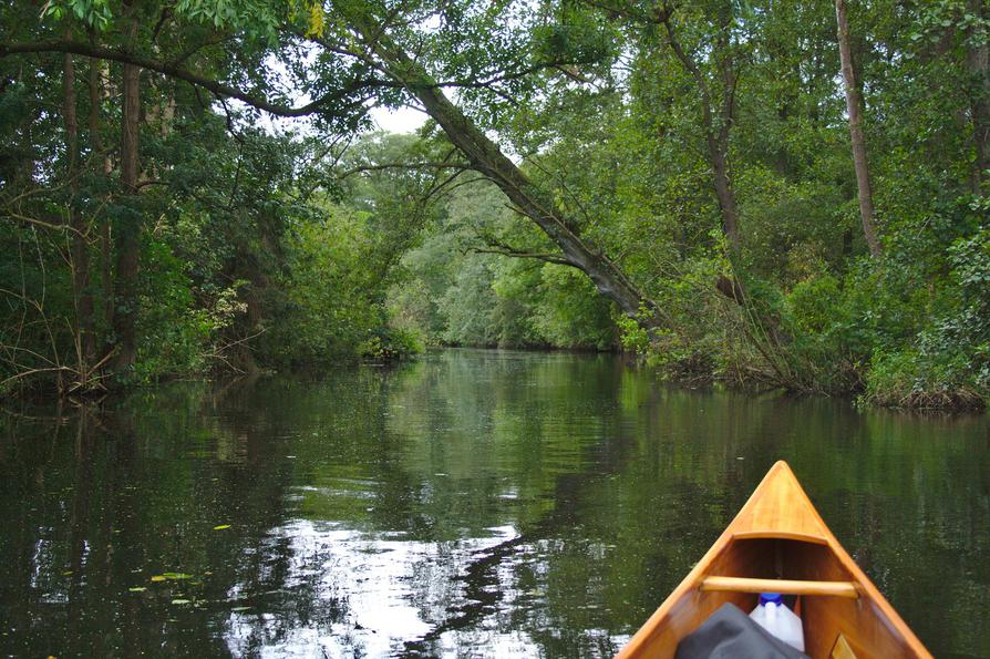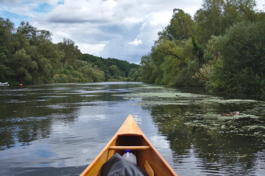 Allerdings drehe ich mein Kanu bald um und paddle zur Einsetzstelle zurück. Wo es windstill ist, genieße ich die gute Strömung und manchmal sogar noch die Sonne. An anderen Abschnitten kommt der Wind heftig frontal oder seitlich, da vergeht mir der Spaß. Der kommt aber immer wieder.