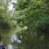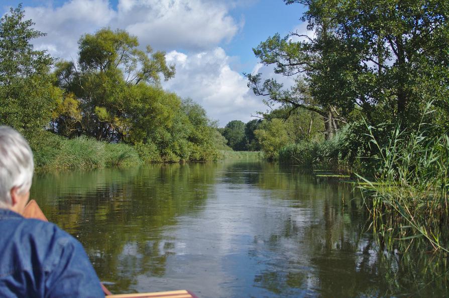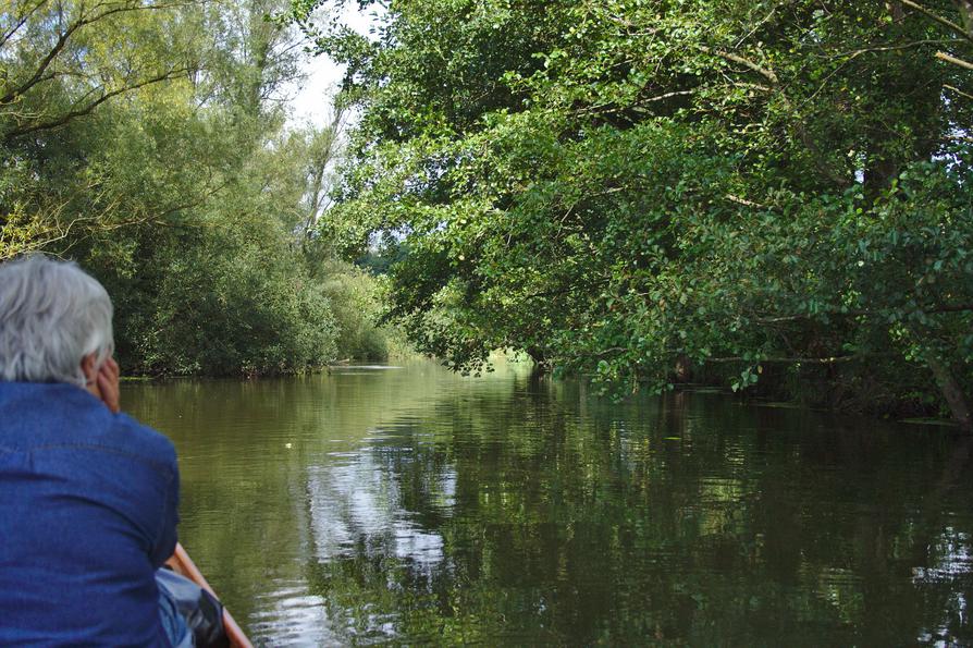 So langsam es irgendwie geht, lassen wir uns die Schwentine abwärts treiben. Dabei beobachten wir Libellen und kleine braune Vögel, die wie Zilpzalpe aussehen. Ab und zu lässt sich ein Zaunkönig hören, und im grünen Bewuchs der kleinen Buchten und auch am Schilfrand sehen wir oft Wasserfrösche mit ihrem großen Maul und ihren goldenen Augen aus der Entengrütze heraus lugen.