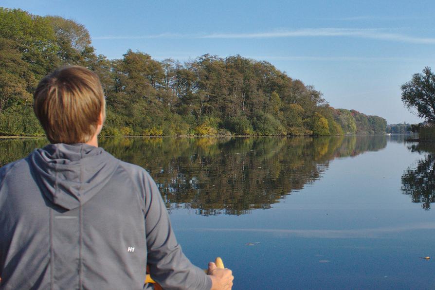 Wieder auf der Großen Breite, paddeln wir langsam in Richtung Plön zurück. Außer dem Traktor ist es recht still. Das glatte Wasser, die leicht diesige Luft und das herbstfarbene Laub verbreitet eine schöne Stimmung und löst in mir eine wohlige Stimmung aus, die meine Mitpaddlerin durchaus teilt. Wir reden nicht viel, genießen nur die schöne Natur um uns herum. Zwischendurch fliegt eine Hornisse zwischen uns hindurch.