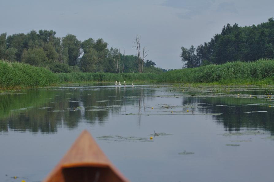 Nach einer sehr warmen Nacht sind wir schon sehr früh auf den Beinen, so dass wir bereits vor halb sechs Uhr das Zelt abgebaut haben und Kaffee trinken. Die Trebel fließt etwas, wie wir an den sehr langsam vorbei ziehenden Wasserpflanzen erkennen können. Das ist hier nicht selbstverständlich, da sie zeitweise stehen kann oder sogar aufwärts fließen.