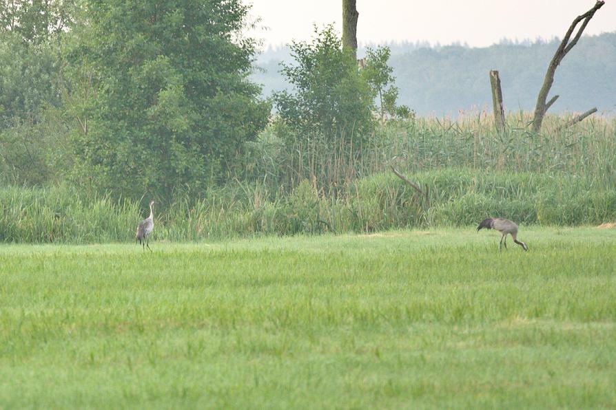 Auch auf dieser Wiese lassen sich Kraniche nieder, und wie wir später auf den Fotos erkennen können, ist ein fast erwachsenes Junges dabei.