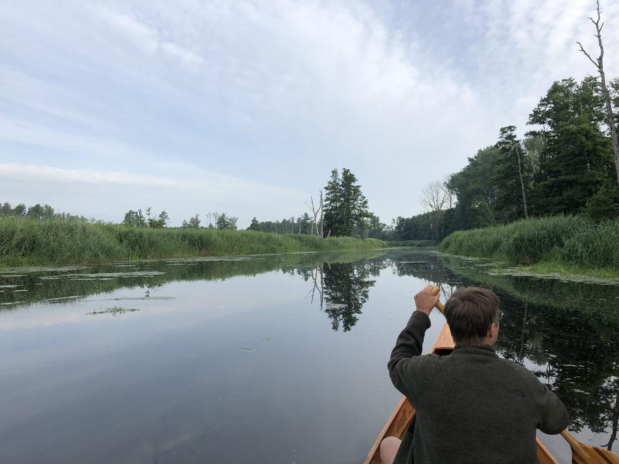 Da sich der Himmel allmählich verdunkelt, paddeln wir etwas schneller als gewohnt. Trotzdem ist uns noch ein seltenes Schauspiel vergönnt: ein Greifvogel stürzt sich ins Wasser und fängt einen Fisch. Leider setzt er sich nicht auf einen der nächsten Bäume, obwohl er zwei Mal dazu ansetzt. Es ist ein Schreiadler, wie wir zu unserer großen Freude feststellen.