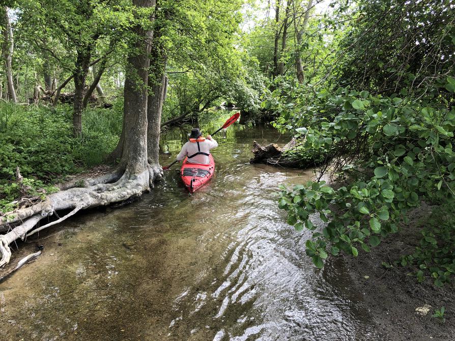 Allmählich komme ich am Viererseegraben an. Während ich mich hier aufhalte und dem vielfältigen Gesang der Vogelwelt lausche, plätschert es und ein Kajak kommt den flachen Graben entlang. Ein Mann bewegt sich langsam und am Ende auch mühsam hin zum tieferen Wasser des Sees. Ich begrüße ihn freundlich und er antwortet mit der Frage, ob es auch in Englisch ginge. Ich tausche mich mit dem Engländer über die vielfältigen Möglichkeiten aus, die dieses Paddelrevier bietet. Er wohnt in Plön, und er möchte auch demnächst mal bis ganz nach Kiel paddeln. Ich empfehle ihm noch den Kauf einer guten Gewässerkarte bei FlussInfo, bevor er auf den See hinaus paddelt.