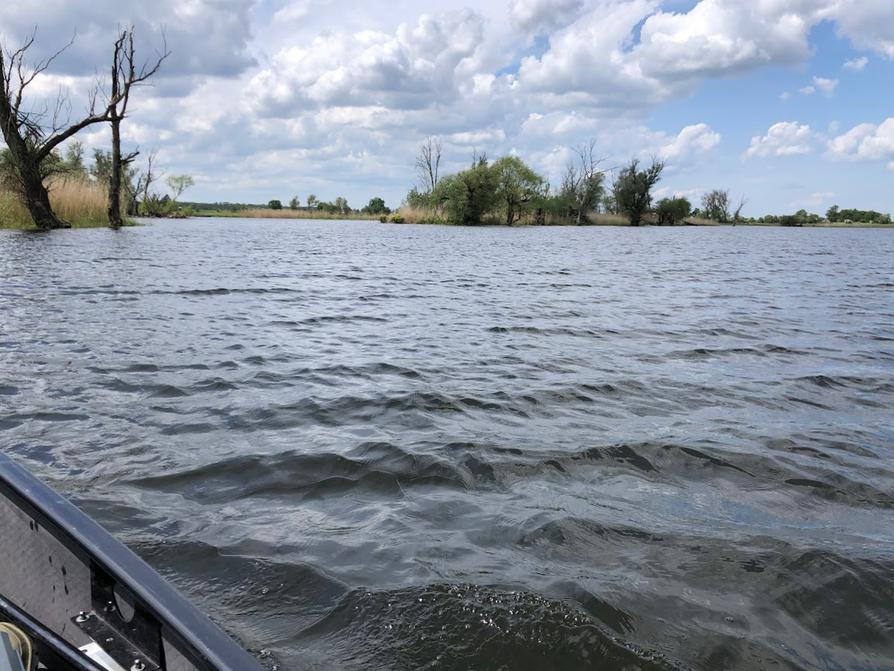 Auf meiner Weiterfahrt steige ich noch auf eine Beobachtungsplattform, von der aus ich einen guten Blick auf die riesige überschwemmte Wasserlandschaft werfen kann. In der Ferne fahren einige Motorboote auf der Unteren Havel.