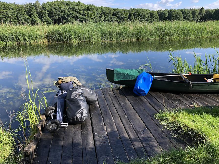 Bis alles trocken ist, vergeht allerdings einige Zeit. Alles andere ist bereits im Kanu verstaut, das auf Rädern steht. Mein Plan ist, die beiden Umtragestellen auf einen Rutsch zu bewältigen, wenn ich mein Kanu schon mal auf dem Bootswagen habe.